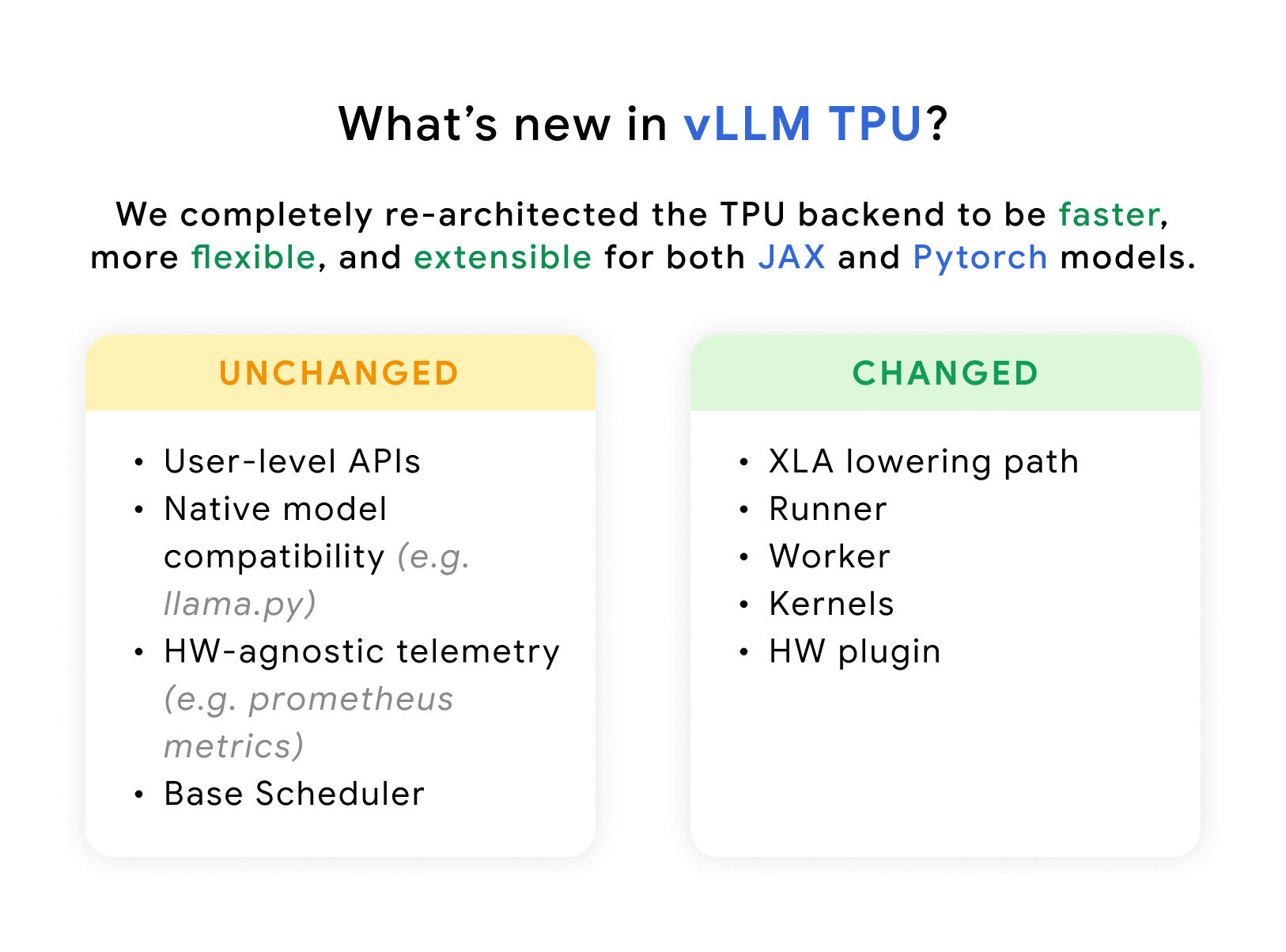 This unification effort reduces duplication by leveraging existing work from the vLLM community, leaving more time to optimize TPU kernels and the XLA compiler. For PyTorch (via Torchax) and JAX models, all kernels and compilers are shared.